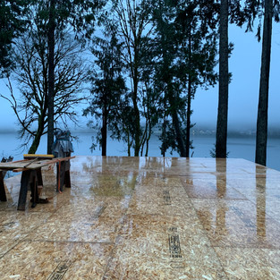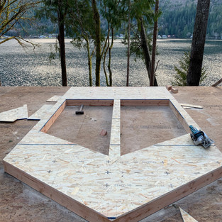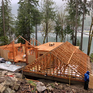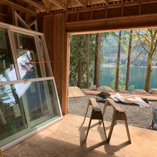 This is looking out of the great room, still so much for the carpenters to do. Not that I had any idea. I like this picture because Jim is out there with his lunch cooler looking out at the lake, and, you'll notice, Boo is parked right behind him. It took a year for that irritatingly jumpy dog to warm up to Chad, Jimmy, and James. It didn't hurt that Chad and Jimmy would drop him pieces of their meals, but it still took forever, so this is part of that story. And that the guys got to know the lake: the little raccoon hiding in the top of the big, leaning fir, the beaver cutting a wide V through the water's edge, the Falls Creek waterfall on the hillside across the way, and sometimes clumsy acrobatics of the eagles. Jimmy kept his binoculars and fishing pole handy. Tom brought in his kayak and a fishing float. I don't know when they ever used those things, because the house just kept growing, and they were the ones growing it.